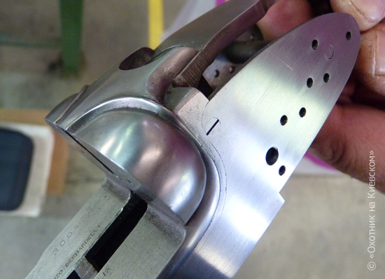 Интересный момент, что ствольная коробка у горизонталок от Bernardelli имеет два отдельных паза для каждого из двух подствольных крюков. Это сделано для обеспечения максимально надёжного запирания ружья и усиления прочности ствольной коробки.