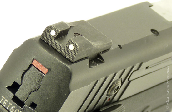 На затворе — по шесть насечек с каждой стороны, лучшего захвата рукой при досылании, что очень удобно, так как пистолет штатно снабжается тугой возвратной пружиной.
