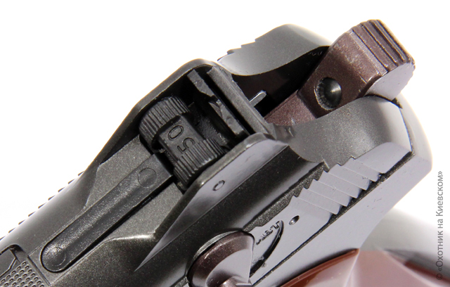 Затвор пистолета цельнолитой, что придает ему дополнительную прочность. Рамка пистолета, хоть и составная из